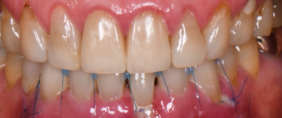 출처 - 권의시선 : 치과의사 권낙현 유튜브  입천장에서 채취한 조직을 내려앉은 부위에 붙인 모습.
